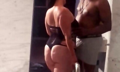 Beautiful Milf with a Humungous Ass in Swimsuit plays with Cuck Husband in Shower