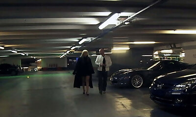 Mature blondie gargles throbbing penis in a car