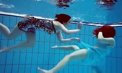 Two stunning teens swimming in the pool like sexy mermaids